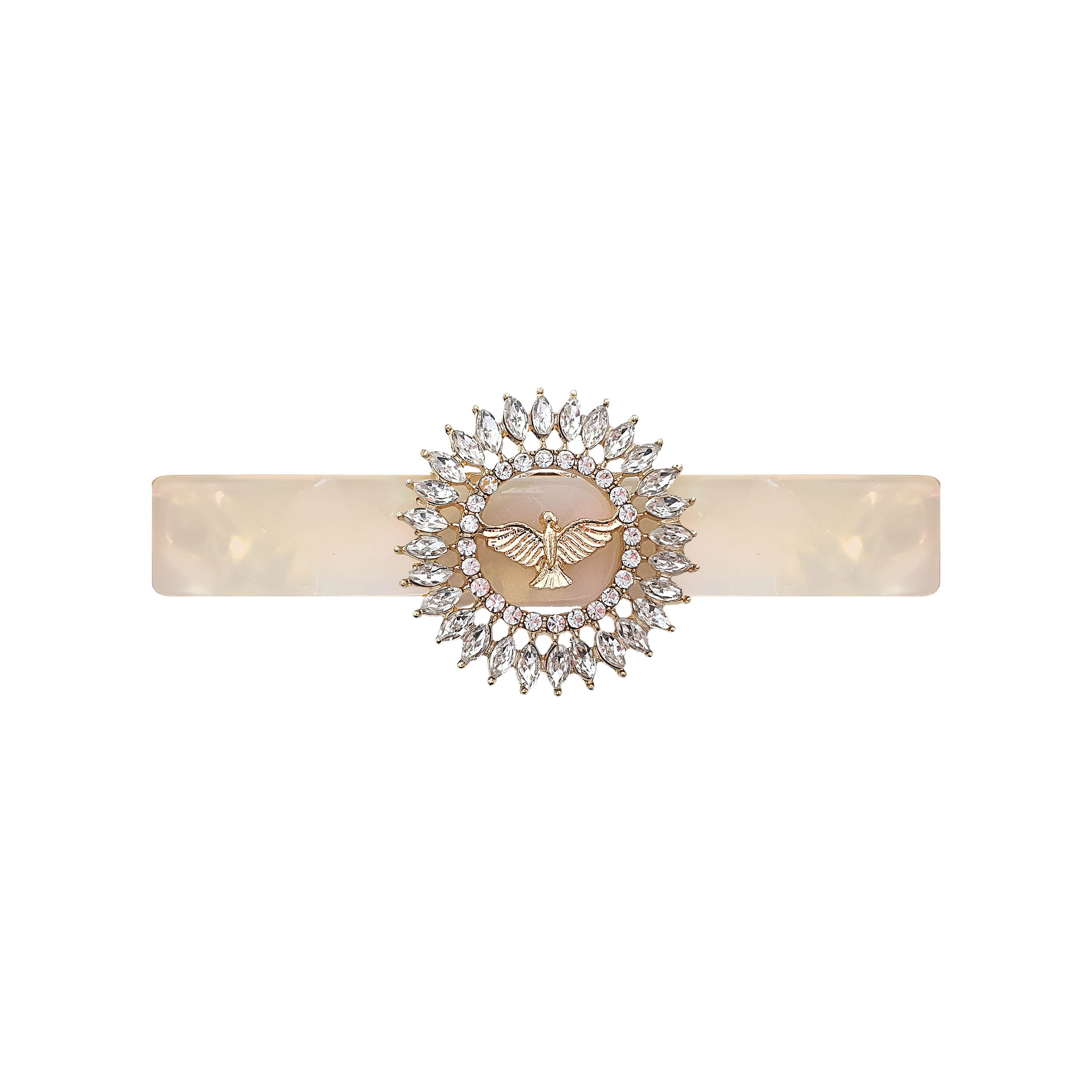 Base de acetato furtacor perolado com aplicação em metal dourado com cristais de vidro lapidados em formato navete